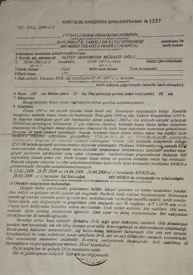 Bu barədə İlkxeber.org-a danışan Məhərrəm Əliyevin dediyinə görə hələ 1997-ci ildə Türkiyədə hərbi təhsil alarkən təlim zamanı ağır zədə alıb. Aldığı zədə nəticəsində onda epileptik tutmalar başlayıb. O, uzun müddət İstanbul GATA xəstəxanasında müalicə alıb. Daha sonra Azərbaycana qayıdaraq tank komandiri kimi xidmətini davam etdirib. Lakin xəstəliyin yenidən baş qaldırması səbəbindən tank komandirliyindən kənarlaşdırıb hərbi hissədə anbar müdiri vəzifəsinə təyin ediblər. Bir müddət sonra səhhətindəki problemlərlə bağlı xəstəliyinə görə ordudan tərxis olunub.