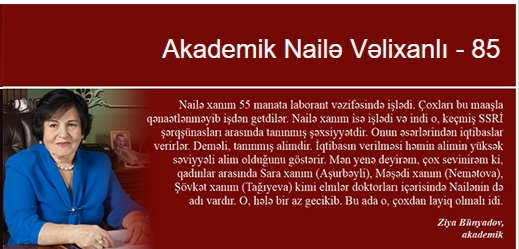 Bu gün tarix üzrə elmlər doktoru, Azərbaycan Milli Tarix Muzeyinin direktoru, Əməkdar elm xadimi, akademik Nailə Vəlixanlının 85 illik yubileyi tamam olur.