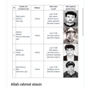 Bildirilib ki, sentyabrın 20-də Mübariz İlyas oğlu Məmmədov Bakı şəhəri, Nizami rayonu, Keşlə qəsəbəsi Şəhidlər Xiyabanında, Səfəralı Alverdi (Allahverdi) oğlu Səfərov Sumqayıt şəhəri Şəhidlər Xiyabanında, Tərlan Kamal oğlu Rüstəmov Bakı şəhəri, Qaradağ rayonu, Lökbatan qəsəbəsi Şəhidlər Xiyabanında və Bilal Qəhrəman oğlu Qəhrəmanov Gədəbəy rayonu, Şəhidlər Xiyabanında dəfn olunacaqlar