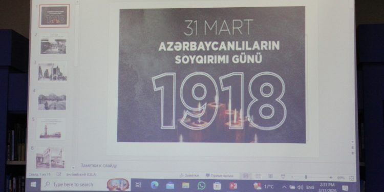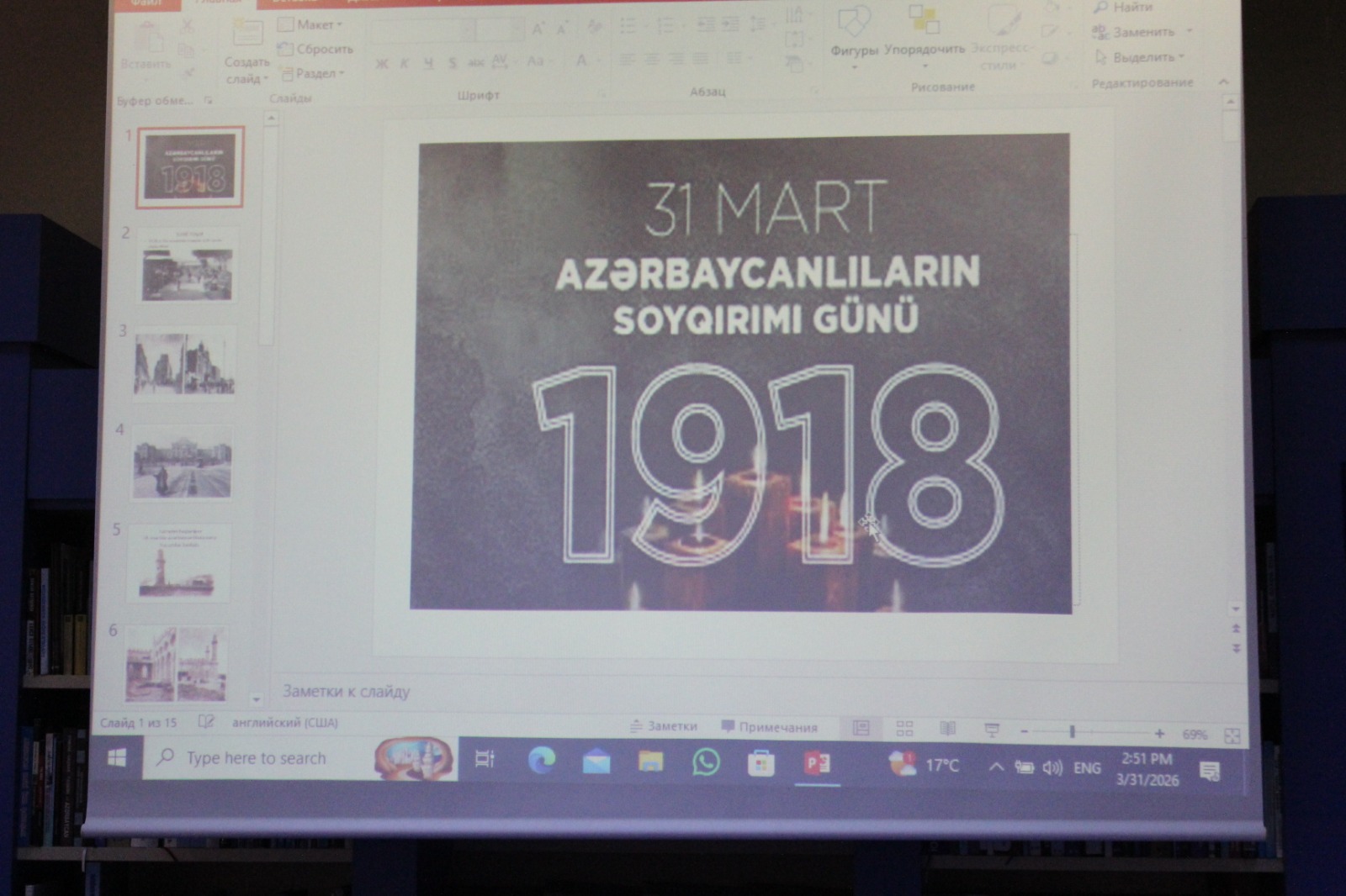 Tədbiri giriş sözü ilə açan kitabxananın əməkdaşı 31 Mart hadisələrinin tarixi mahiyyəti, bu faciənin xalqımızın yaddaşında buraxdığı izlər haqqında ətraflı məlumat verib. Bildirilib ki, Ümummilli Lider Heydər Əliyevin 26 mart 1998-ci il tarixli Fərmanı ilə 31 mart “Azərbaycanlıların Soyqırımı Günü” elan edilib. 31 Mart təkcə matəm günü deyil, həm də tariximizi dərindən öyrənmək və gələcək nəsillərə ötürmək məsuliyyətini xatırladan önəmli bir gündür.
