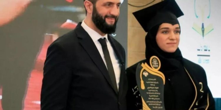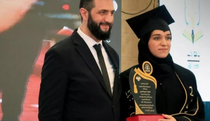 Suriya Prezidenti Əhməd Əş-Şara İdlib Universitetində keçirilən məzuniyyət mərasimində həyat yoldaşı, ölkənin birinci xanımı Latifa əl-Droubiyə diplomunu şəxsən təqdim edərək tədbirə simvolik və emosional bir məna qatıb.