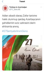 Türkiyənin Azərbaycandakı Səfirliyi 27 Sentyabr – Anım Günü ilə əlaqədar paylaşım edib.